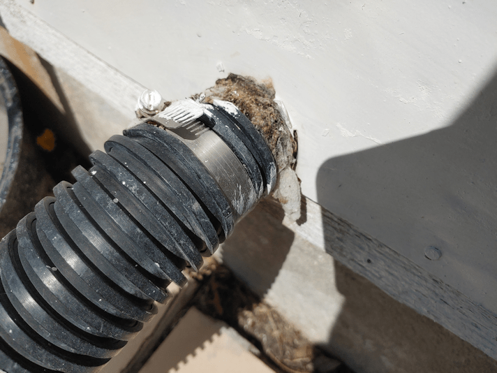 We’ve got this semi-rigid hose cobbled together, instead. The diameter of this hose, however, should fit the hose kit. It was on the other side that the size is somehow modified so the larger diameter flexible hose could be attached. I had looked at it before and saw that it was clamped very close to the wall, but could not see what it was clamped too.