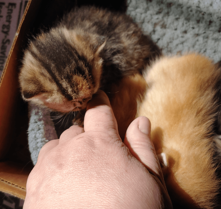 I’m glad Beep Beep used this cardboard nest we set up to have her kittens in. The box is the base from a case of cat food tins. Not only did it turn out to be the prefect size, but it makes it easy to slide in and out of the crate (which is on its side) to check on the babies.