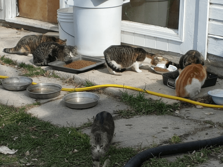 Then it was time to tend to the outside cats, and we had quite the crowd this morning!