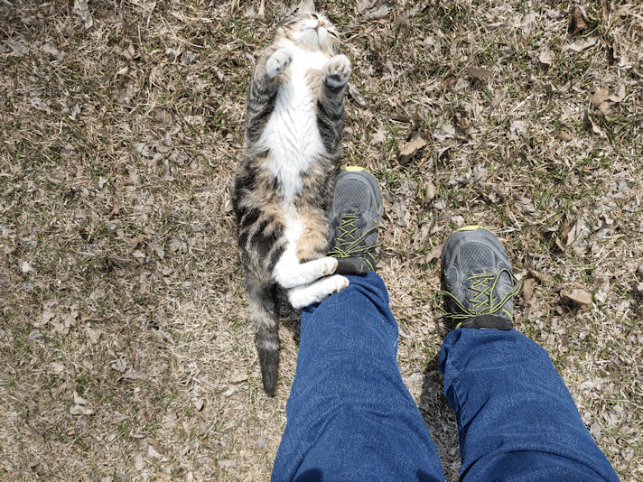 He just HAD to fling himself bodily across my feet and start rolling! He eventually slithered his way across my feet, around my legs, to eventually end up sitting at my other foot, looking up at me, as if to say “why haven’t you picked me up yet?”