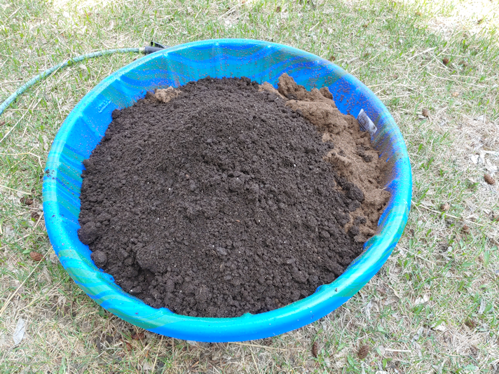This is two bags of garden soil, two bags of compost, and the remainder of our bale of peat; about 1/3. The pool was just enough for all that, plus room to mix in water.