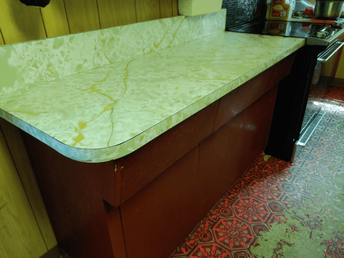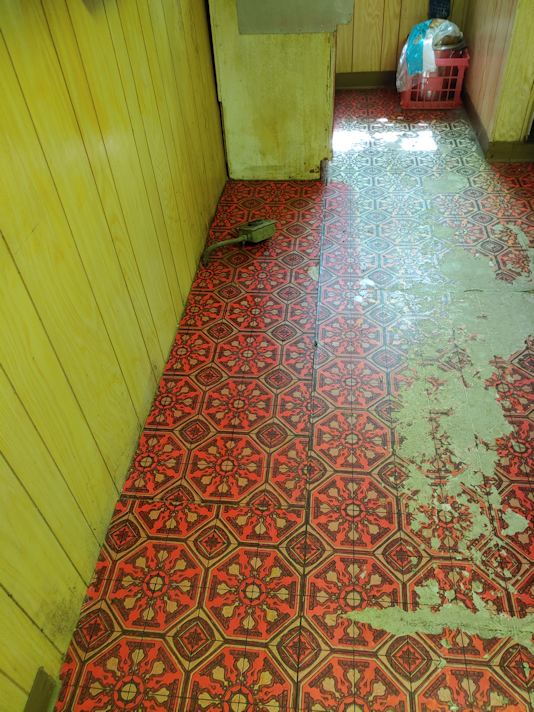 That floor is just … wow. The difference between the part worn out from decades of feet, and the part under the counter, could not be more dramatic!