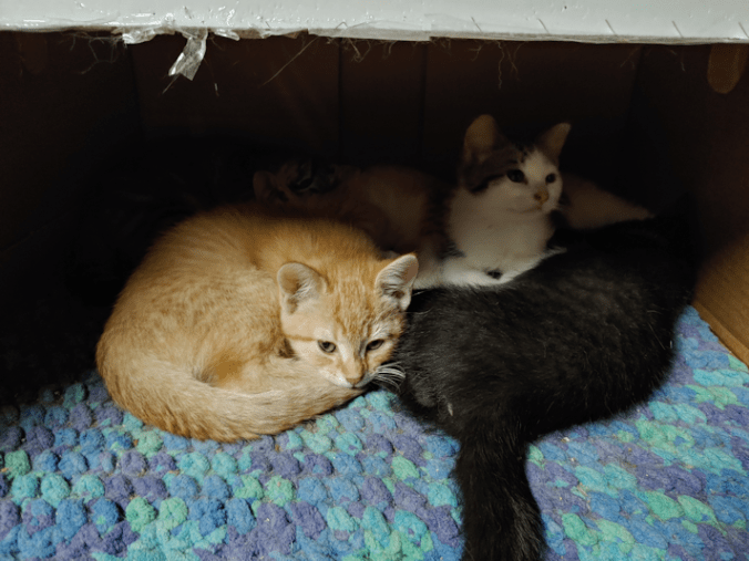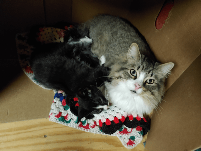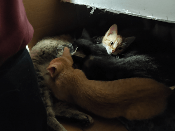 Until my husband came down, and he ended up with kittens nursing behind his butt. :-D Finally, Beep Beep got tired of that – and she joined David!