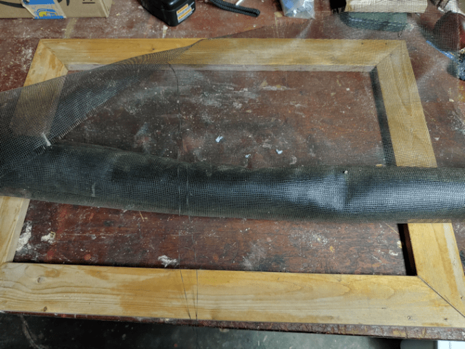 I don’t know how long that roll had been sitting there, but it was just caked with dust!!! Enough to make unrolling it very… sticky. :-/ I cut the mesh larger than the frame, so that I could fold the edges in, for extra strength.
