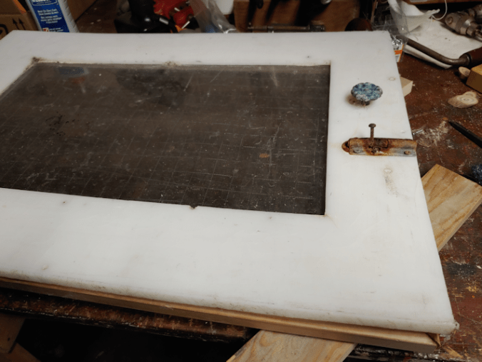 Next, I needed to add handles. I used cast off pieces of wood under the metal plates, to keep the adhesive off the worktable. I’d already accidentally screwed it to the table. I didn’t want to glue it, too! :-D