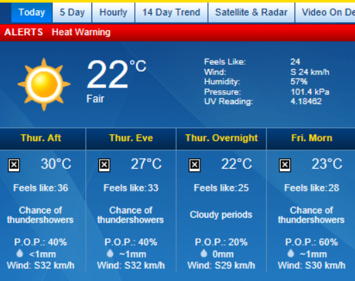 We’re looking at a high of 32C/90F this afternoon, with the humidex bringing it to 42C/107F.