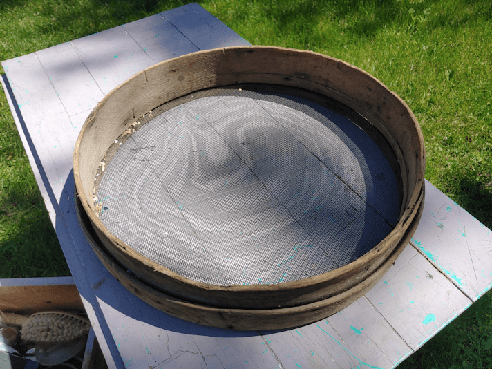 Of course, there were all sorts of things the girls cleared out. The dresser in the photo being one of two larger items, plus lots of things like this sifter screen. It was used to clean the chaff and dirt out of seeds. It’s old and the wood is rotting, but it’s being kept. It’s very likely my dad made it himself. The screen is ordinary metal window screen. The wooden frame was very likely salvaged from a peach basket or something like that.
