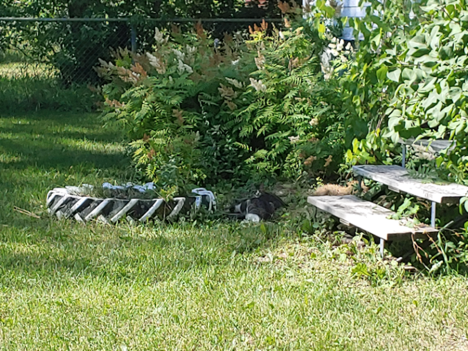 After checking the sunflowers and making my way back to the house, I saw Stinky again – with a friend! – running through the back yard towards the old garden shed. Of course, that was the direction I needed to go! I was able to skirt around them, then use the garden hose to discourage them from coming closer.
