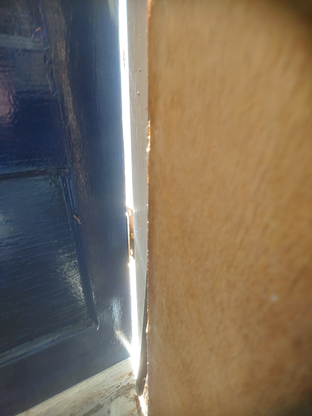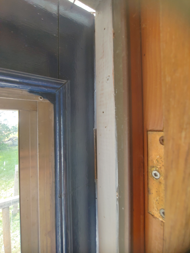 Once that is done, then I’ll double check how much I need to trim the 2 pieces of door frame that we took off. For now, though, the door stays closed because it’s stuck at the bottom corner, where I have to lift it over the door jam. With the outside door closed, the inside door will now stay closed (it blows open easily, otherwise).
