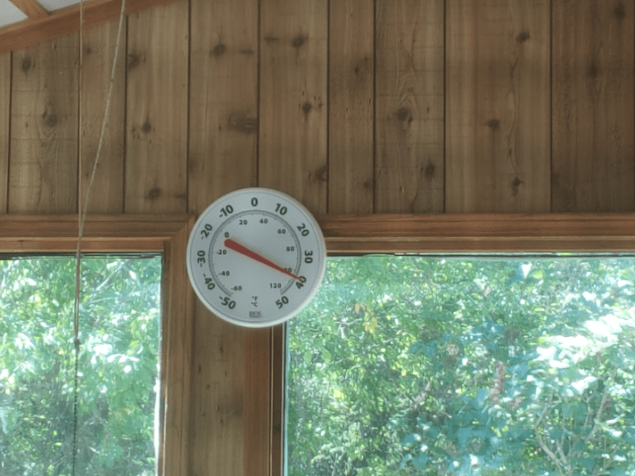 If we were still keeping the doors open for the cats, I would have had the ceiling fan on to help at least a little. Right now, I just have the replacement door open – it has a screen window that actually opens and closes, unlike the one we replaced. :-D My mother used to have lacy curtains on all the windows because of how hot it would get in here. I can understand why, but it sort of defeats the purpose of having a sun room.