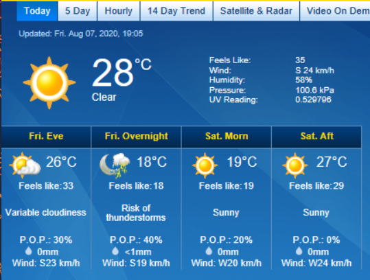 It was already cooling down when I took the above screencap. 28C/82F, with the humidex bringing it to 35C/95F From the weather radar, I don’t expect to get that predicted thunderstorm; it appears to be moving to the north of us. I hope we’ll at least get some rain. It’s been a challenge to keep the garden beds watered. At least I haven’t needed to mow the lawn in a while. :-D