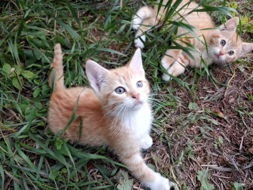 Two of Junk Pile cat’s kittens were running around while I was out. Little Braveheart was following Creamsicle around. He seems to get along with them very well! I topped up the kibble bowls, and while he was eating, Little Braveheart came over and booped her head against his before starting to eat, herself. :-) So cute!