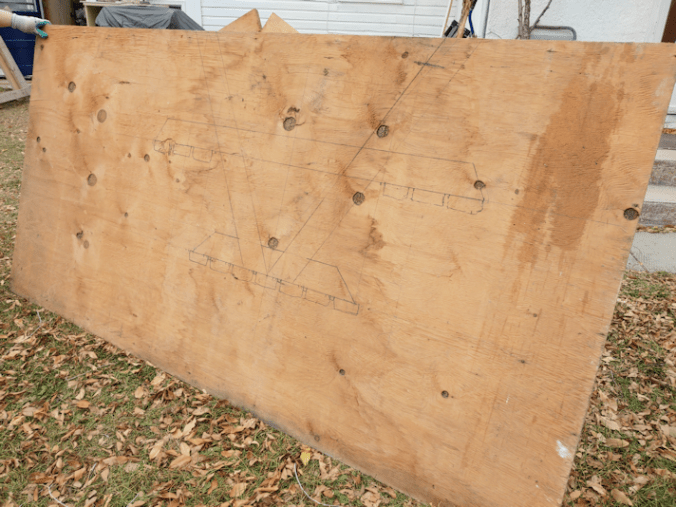 We cut one of the squarish pieces in half to get the height of the wall, then cut one of the halves shorter to fit, and used them for the back wall. The pieced we’d cut off turned out to be the right size for a side wall, so we just traced that on the other squarish piece of plywood and cut a second one.
