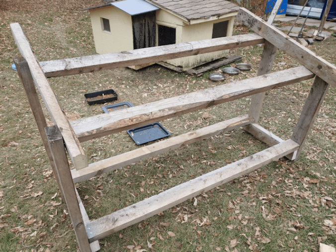 This was where things began to deviate from the plan. In putting on the bottom horizontal supports, I forgot I’d intended to put them on the inside of the vertical supports, instead of lined up with them. This made it longer than 6 ft.