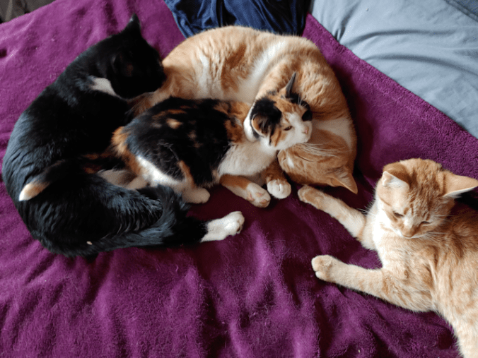 Then Grandma came over and started grooming her. Before I knew it, she was snuggled in with Cheddar, who took over the grooming, and cuddling ensued!