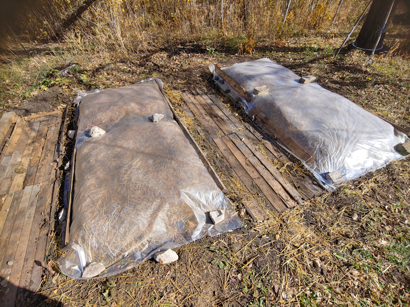 There are a few things going for these beds that should help with our planting this late in our zone. Burying the organic matter at the bottom of the beds means there should be some warmth generated as they break down, just as it would have if it were in a compost pile. The mulch will also help regulate the temperatures and, finally, the plastic should help keep things a bit on the warm side. I don’t want it warm enough for the garlic to start sprouting, but they do need to start their growth below ground before winter temperatures set in.