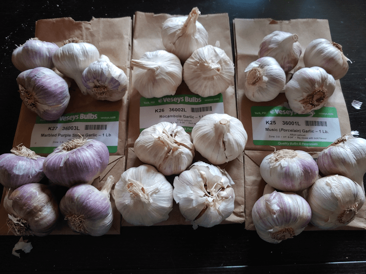 This is what 1 pound of each variety looks like. I wasn’t sure how many bulb heads or cloves that would translate into. That was the main reason I wasn’t sure if the two beds I’d prepared for them would be enough. At least I was reasonably sure it wasn’t going to be too much space! :-)