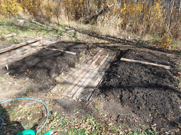 I had been watering the prepared beds, to try and get moisture down to the layer of compost and straw buried inside. Unfortunately, I wasn’t able to do that as often as I’d wanted to, so I gave them another thorough soak.