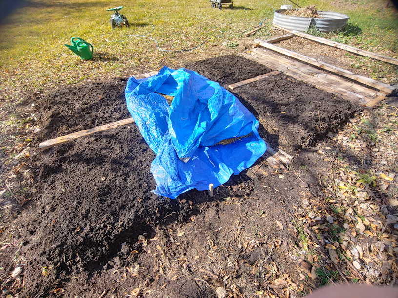 It took only 2 bags to fill the wagon, it’s so fluffy. LOL I laid out a tarp near the beds the garlic will be planted it, to make it easier to work with when it’s needed – plus I can fold half the tarp over the pile to keep the wind from blowing it away.
