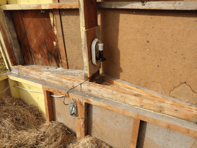 While my daughter was fussing with the cover and putting in the heater, I did some clean up inside. The straw is covered with a large, heavy crocheted blanket – and the cats pooped on it. After getting that out, I decided there was just too much of flax straw in there for my comfort, so I took most of it out, pausing only to help my daughter set up the extension cord to test the heater.