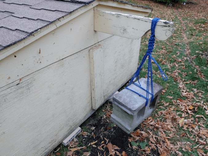 I dug up a cinder block and, with the crate to support its weight, tied it to the support, which runs the entire length of the roof.