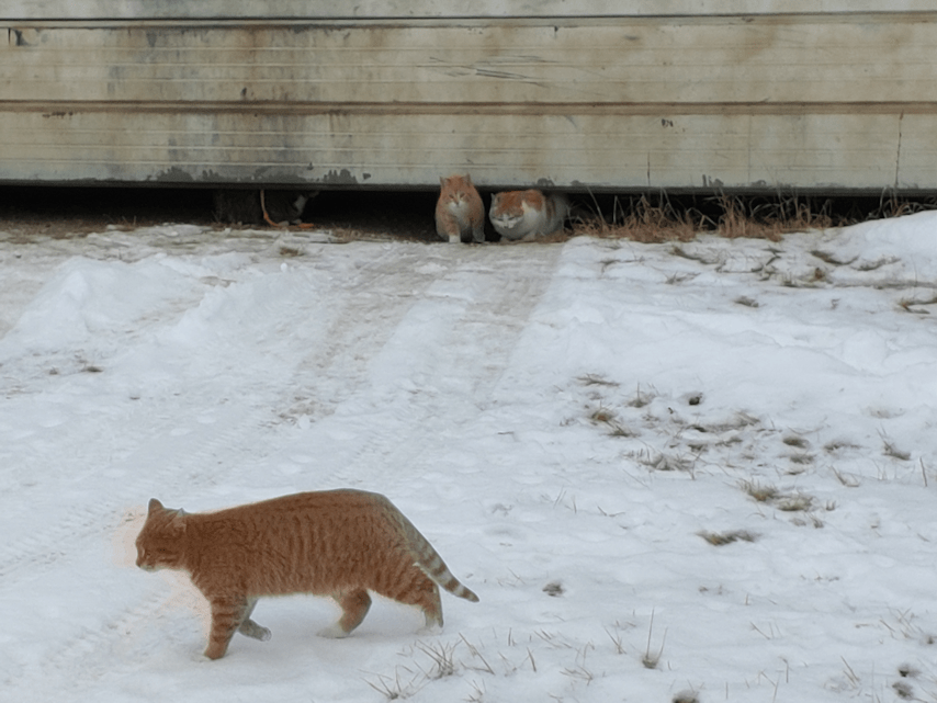 This morning, while doing my rounds, I had a whole crowd of kitties following me. I thought it was 6 at first, then a 7th one popped out of the snow at me! :-D