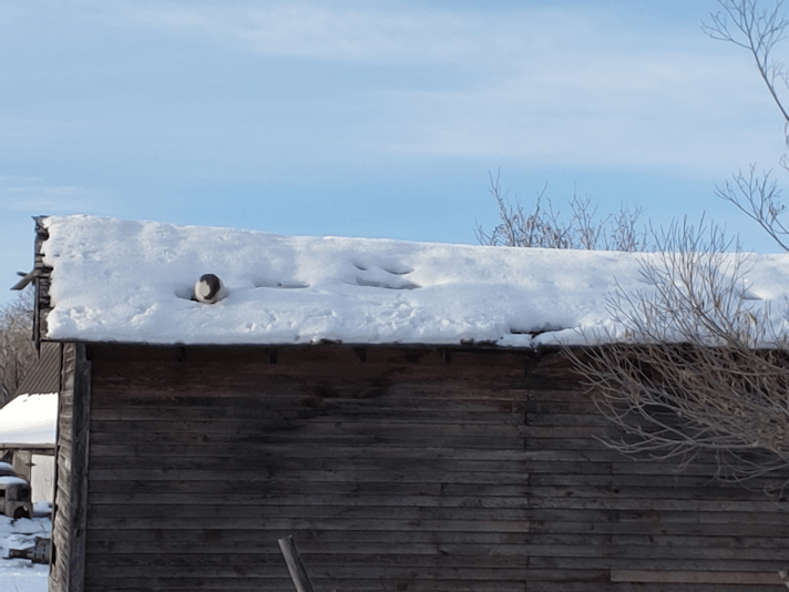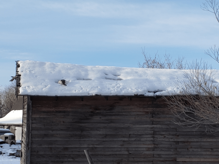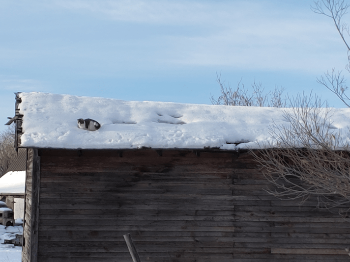 This old shed’s roof is falling apart, and it looked like she was trying to decide if she could jump down through one of the holes.