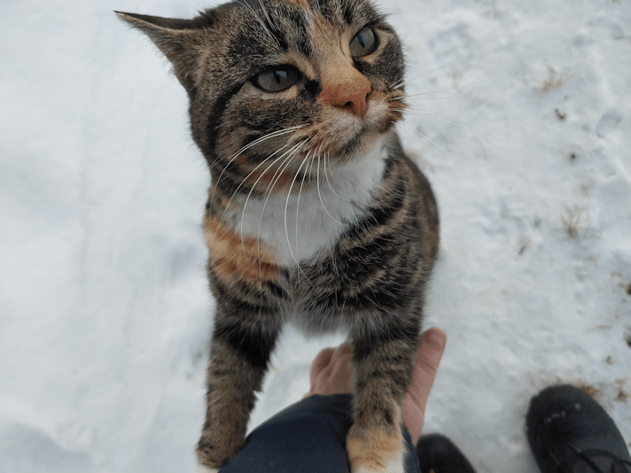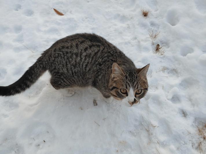 There was only one problem, though. I had a crowd of cats following me as I did my rounds, which is usual when it’s wonderfully mild as it is today. Butterscotch tends to pick fights with the other cats, but this morning, after she hissed at Potato Beetle when he got too close, he actually went at her! As I moved to break it up, Butterscotch ran off, but Potato stayed, intently sniffing at the snow. Some of her kittens came by, and they started sniffing the snow, too.