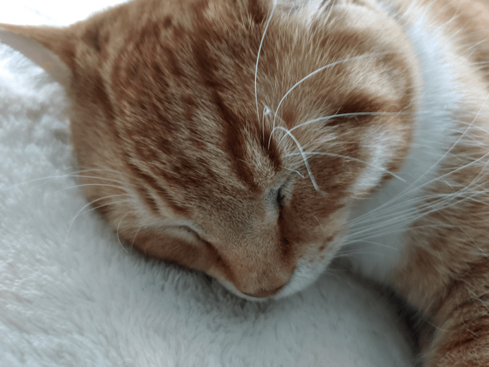 He is such a calm and quiet cat. We brought him indoors to better treat his eyes; they were never as bad as his brother David’s, but they were not really getting better. Even as a kitten, we could tell he would have a sweet and calm disposition as an adult. We probably would have brought him in much earlier, if his cousin Cheddar hadn’t impaled himself with a stick through his armpit and needed to recover indoors from surgery.