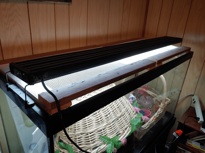 Once the second cover was done, I unpacked the light fixture, which has been sitting in its box next to the tank since the move, and tested it out. Considering what a disaster the movers were, I would not have been surprised to find the bulbs shattered or something.