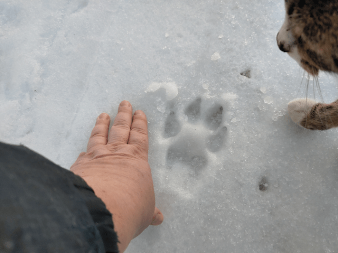 My brother’s dog has huge paws! :-D With yesterday’s warmth, followed by the overnight freeze, there were a lot of his tracks sunk deep into the snow during the warmth of the day, then frozen overnight. :-)