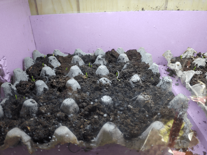 If you look closely in the photo, you can see white specks in the peat. Those are little curled sprouts, pushing their way through the peat!