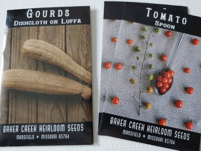 The Luffa gourds are something I ordered just for me. I don’t know that we’ll even be able to plant any this year, but with how quickly seeds have been running out again this year, I figured I’d better get them. As it is, I’m planning to try growing just a couple of each variety, rather than planting entire seed packets, so I’ll likely try starting some of these indoors, too. They are edible when young, but I’m interested in them for the sponges.