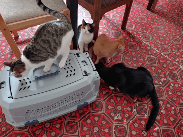 Which had the other cats VERY interested! He didn’t make a sound, though, and just sat there.