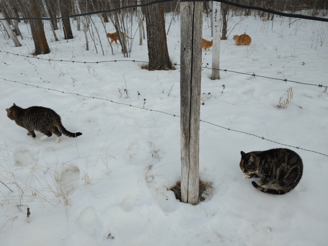 Once the water was taken care of, I fought some kitties off the bowl of meat juices and split it between the various food bowls. More room for more cats to have a treat! The very last bits in the bowl, which had chunks of meat in it, went into Potato’s bowl in the sun room. He had gone outside after I’d opened the door, but it didn’t take much for him to go back in! We are a bit concerned about him being alone and lonely in there, but he seems to be content over the whole situation.