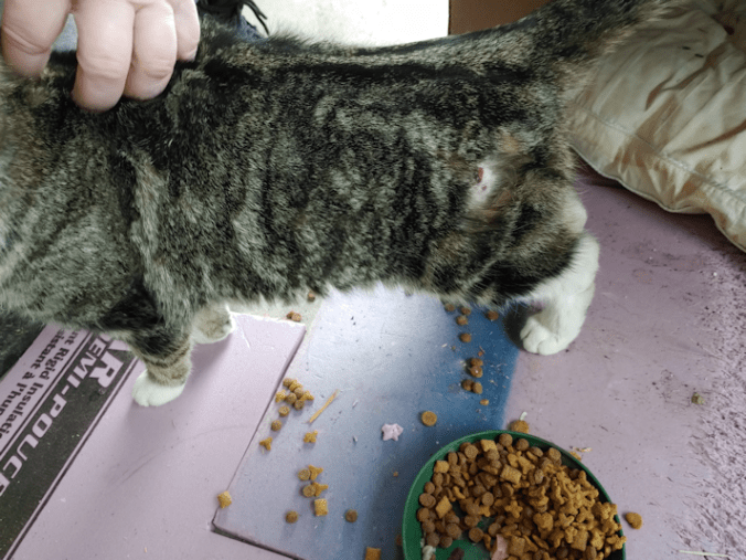 You can tell from this first one, why the wound was so hard to see. If it had not been so matted and had dry blood in the fur, yesterday, I would not have noticed it. Today, it looked much cleaner.