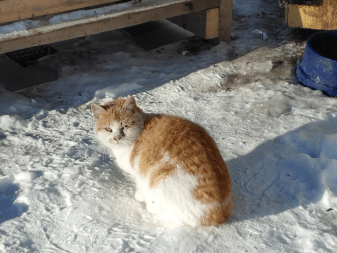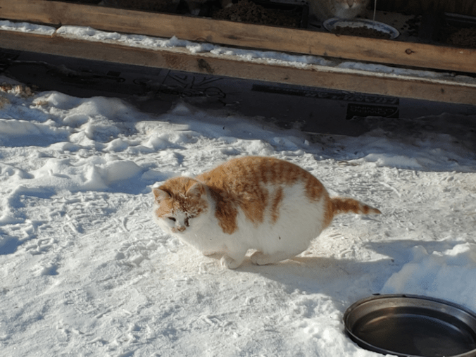 You can see some frost on the tips of his fur. All of the cats that came out had frosted tips! I don’t know where they were sheltering instead of their cat house, but wherever it was had enough humidity to get them frosty.
