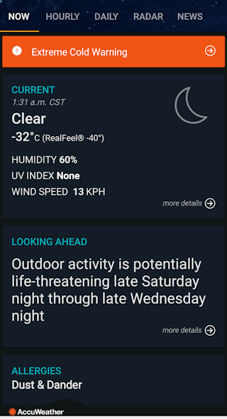 As I am writing this, The Weather Network app has us at -31C/-45C (-23.8F/-49F), while my Accuweather app on my phone has us warmed up to -30C/-42C (-22F/-43.6F).