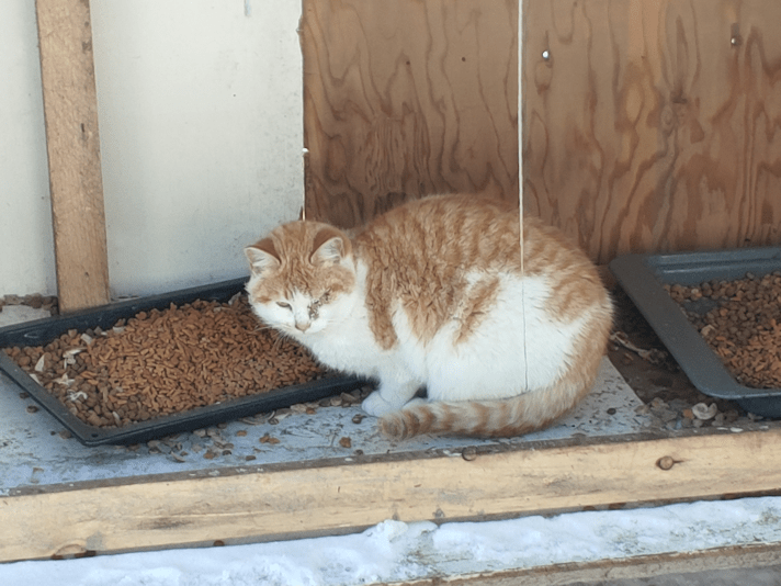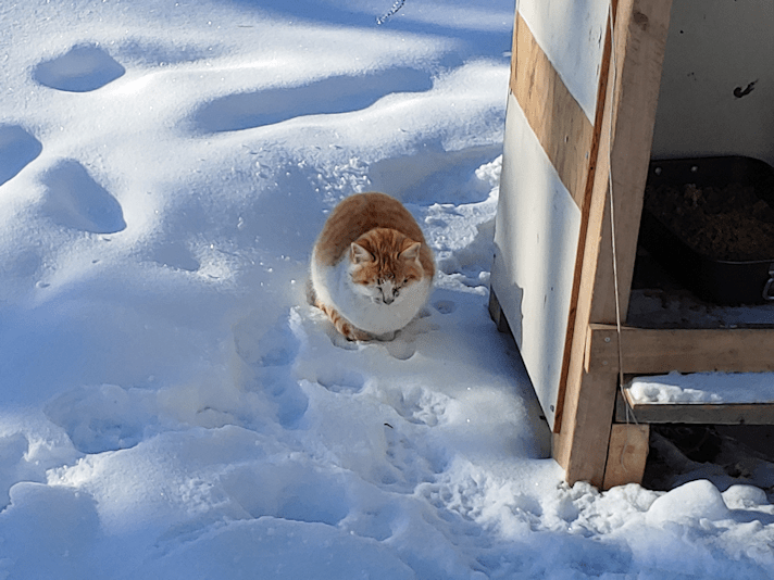 You can see some frost on the tips of his fur. All of the cats that came out had frosted tips! I don’t know where they were sheltering instead of their cat house, but wherever it was had enough humidity to get them frosty.