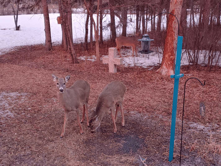 There were actually five in total, but they were chasing each other around. The mama of the two in front chased the one you can see behind the cross, who chased another deer out of that spot before I got the picture. The fifth one that I saw making its way long the edge of the spruce grove disappeared before reaching the feeding station, and I missed what happened with that one.