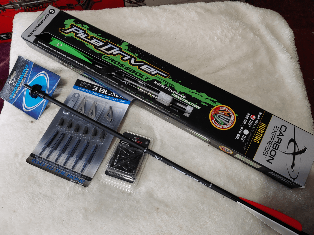 The crossbow kit comes with 3 bolts with field points. Bolts will get lost or damaged, so I picked up a 6 pack of extras. The spares do not come with points, so I picked up a 12 pack of field points. They are slightly heavier than the ones in the kit, so we won’t be using the kit points at all. I also picked up hunting points that need to be assembled, but they are the same weight as the field points. I also got a de-cocking bolt, which can be safely shot into the ground.