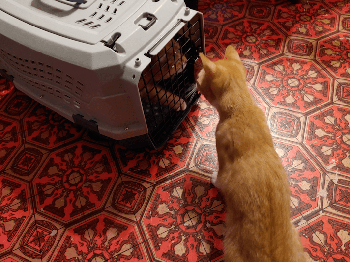 He wasn’t too happy with all the other cats circling around him in the cage, though!
