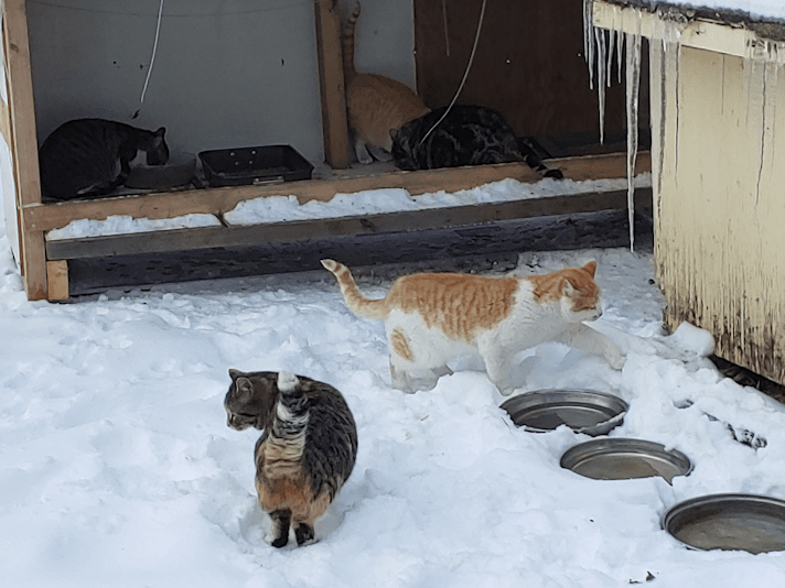 The weather at least seems to have kept away the skunks, as there was still some kibble left in their food bowls.