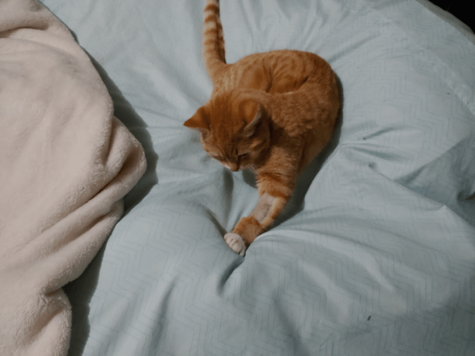 I should put the freshly washed blanket into the shelf, but I’ve discovered the cats love a folded up blanket on the corner of the bed, as a bed of their own. Ginger is no exception!
