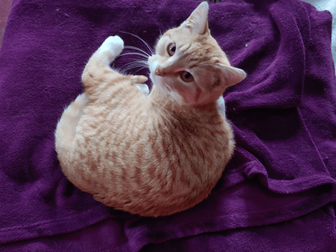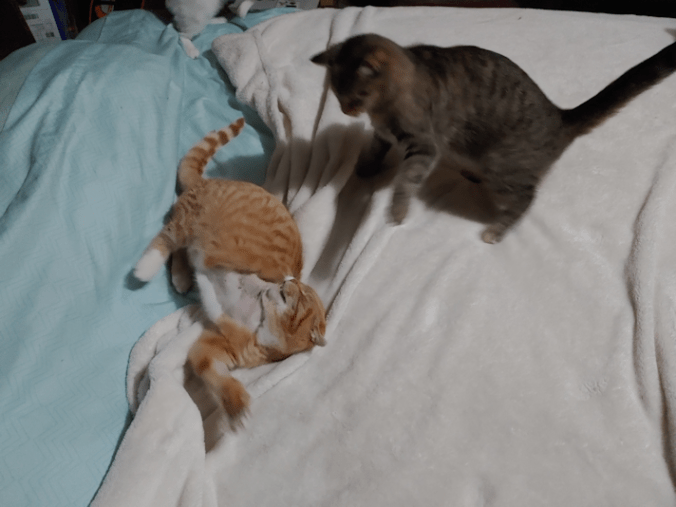 Well now! I was hearing the sounds of a cat playing behind me as I wrote this, so I took a look. It’s Ginger, running around and batting a cat toy around! Yes, he’s found a way to run and bat at a toy with his one front leg, at the same time!