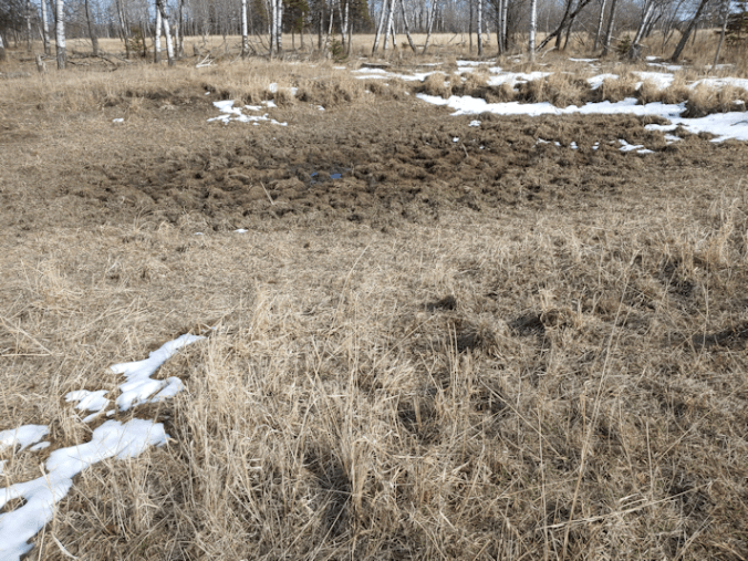 Finally, some water! This is the old gravel pit, and you can see by the lumpy ground from the renter’s cows, how high the water would usually be. This is deep enough, and there’s enough clay under it, that it is very rare for this spot to have no water at all. There is a low, marshy area that runs from this spot, towards the dugout in the previous photo, and there’s no water in there at all. Just mud in a few places. I could hear frogs, though, so that’s encouraging.
