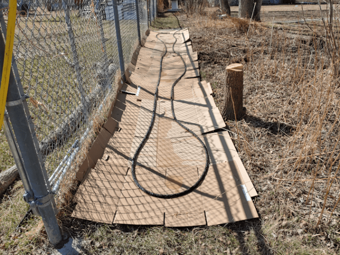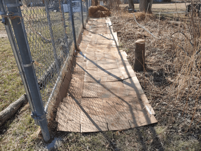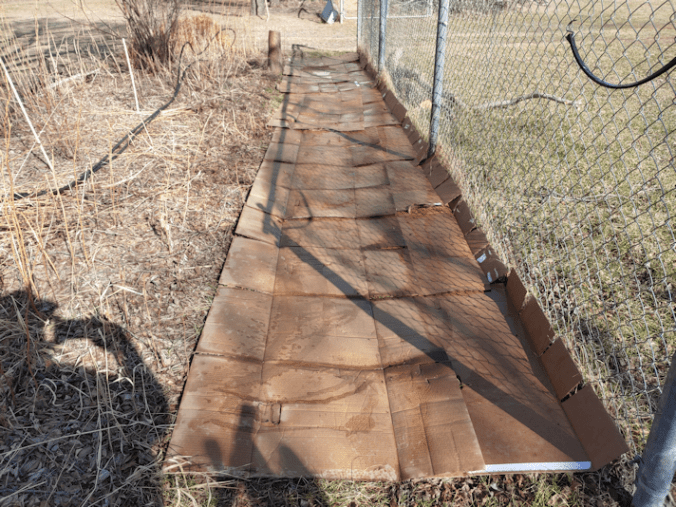We’ve been saving the cardboard boxes from cat litter, and their flaps were placed against the fence as a short barrier to hold in the soil.
