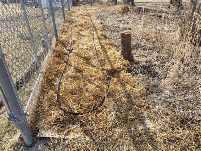 We probably could have left the water running all day to soak it thoroughly, but we didn’t bother. We did move the soaker hose over by the haskap berry bushes, though, and left the water running while we moved on to the next step: spreading the straw.