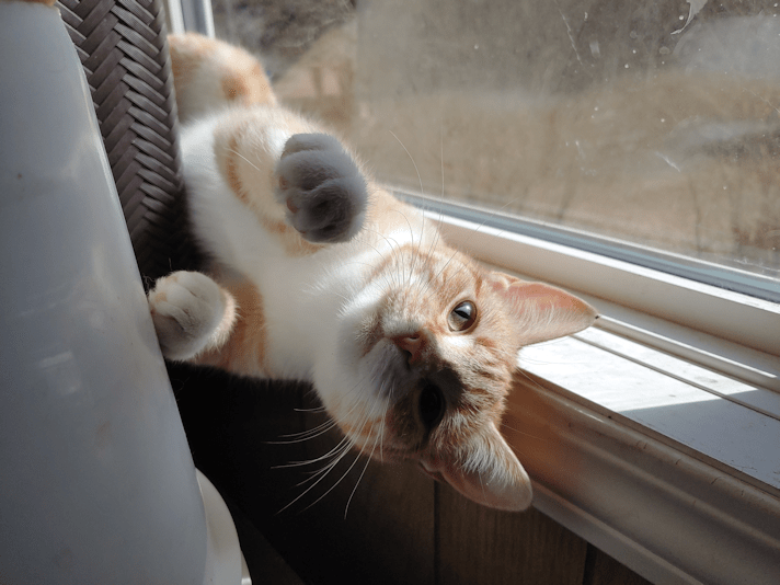 She is also a vicious beast. ;-) Her favourite thing it to suddenly launch herself across the room, onto whichever human is passing by. She typically lands about half way up, and then starts sliding down.