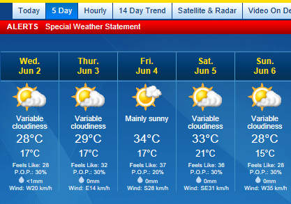 Today’s high was predicted to be 24C/77F. Instead, we reached 28C/82F. Tomorrow’s high is supposed to be 28C… does that mean we’ll be going to break 30C/86F? :-(